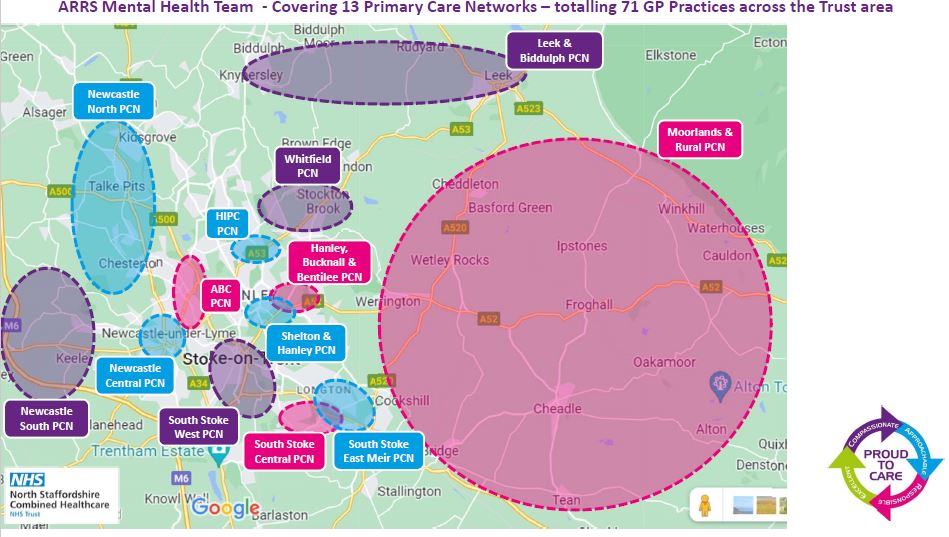 The Primary Care Mental Health Team Is based in GP practices across North Staffordshire and Stoke-on-Trent. The team consists of mental health professionals who provide specialist mental health support and can advise GPs and other practitioners in the assessment and treatment of mental health within primary care.